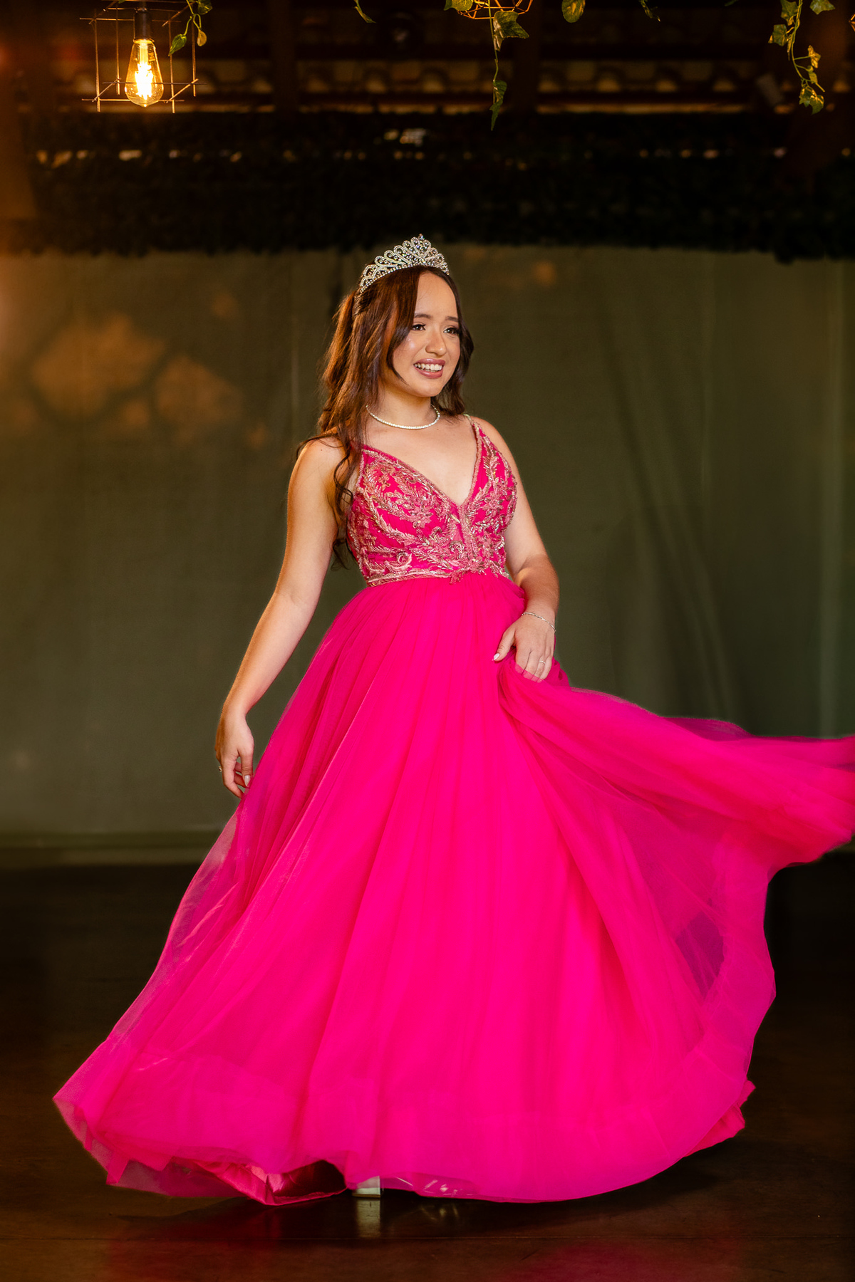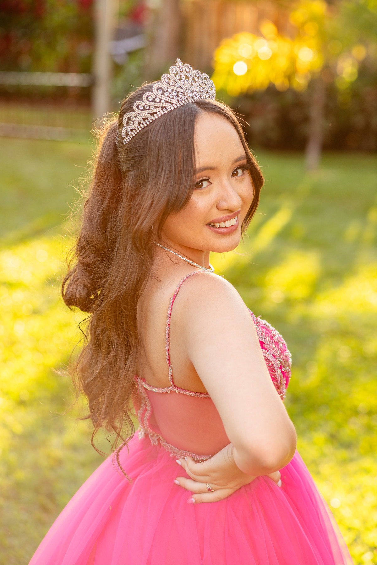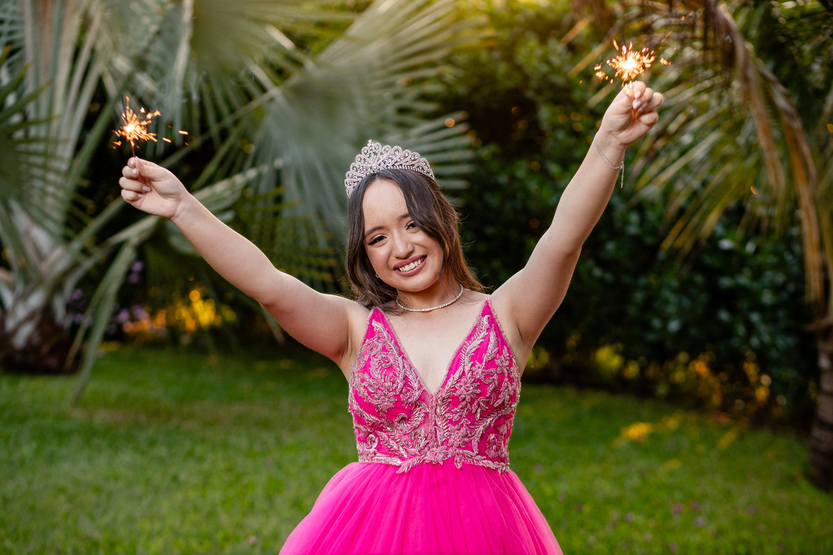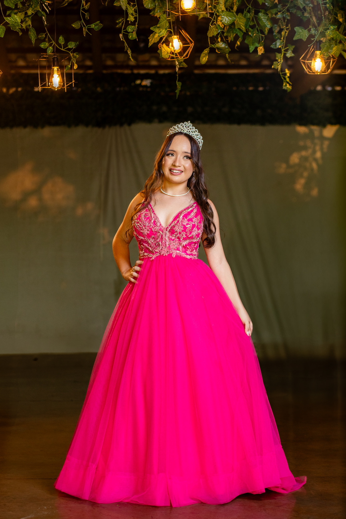 A debutante brilhou ainda mais com um lindo vestido cor de rosa, que esvoaçava com delicadeza a cada passo. Para completar o look digno de um conto de fadas, ela usou uma coroa de princesa, que ressaltava sua beleza e simbolizava toda a realeza do seu grande momento.