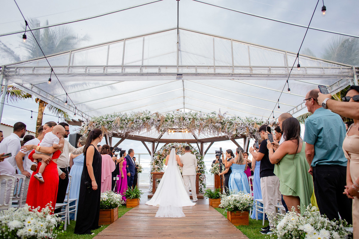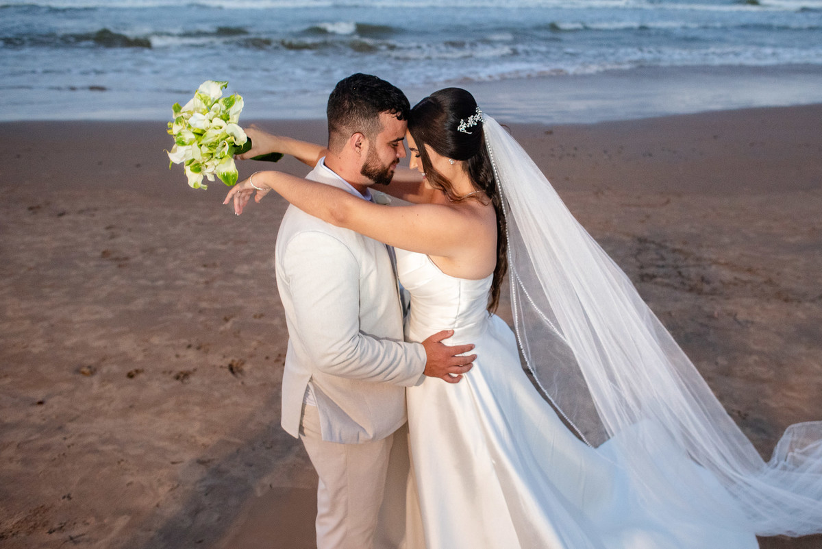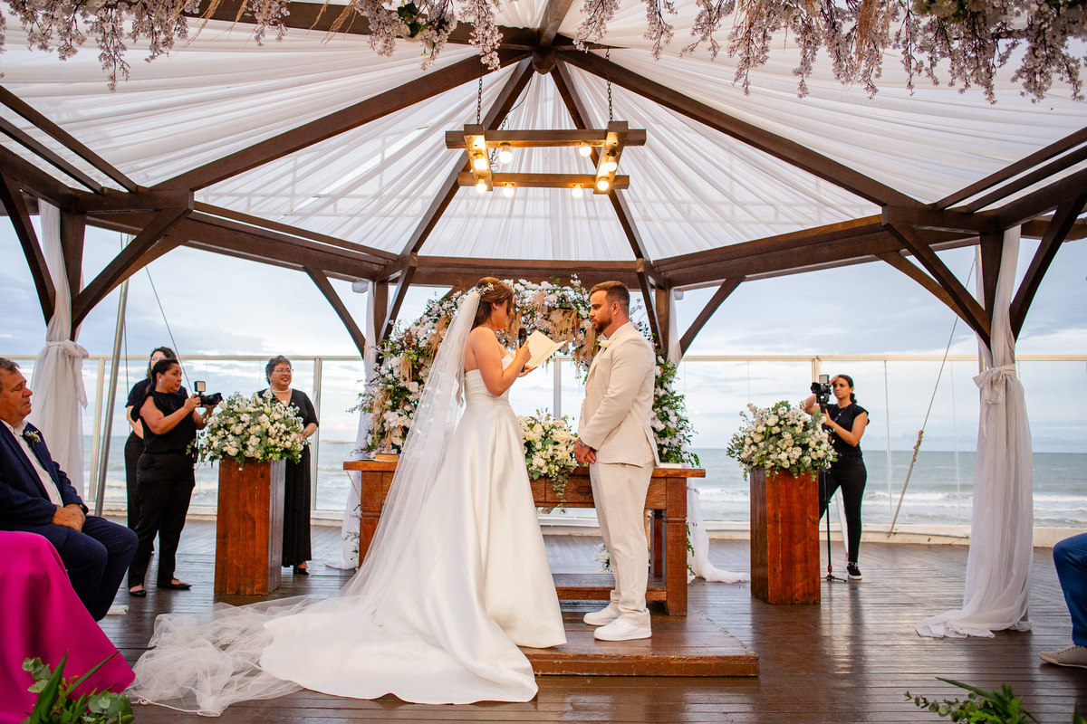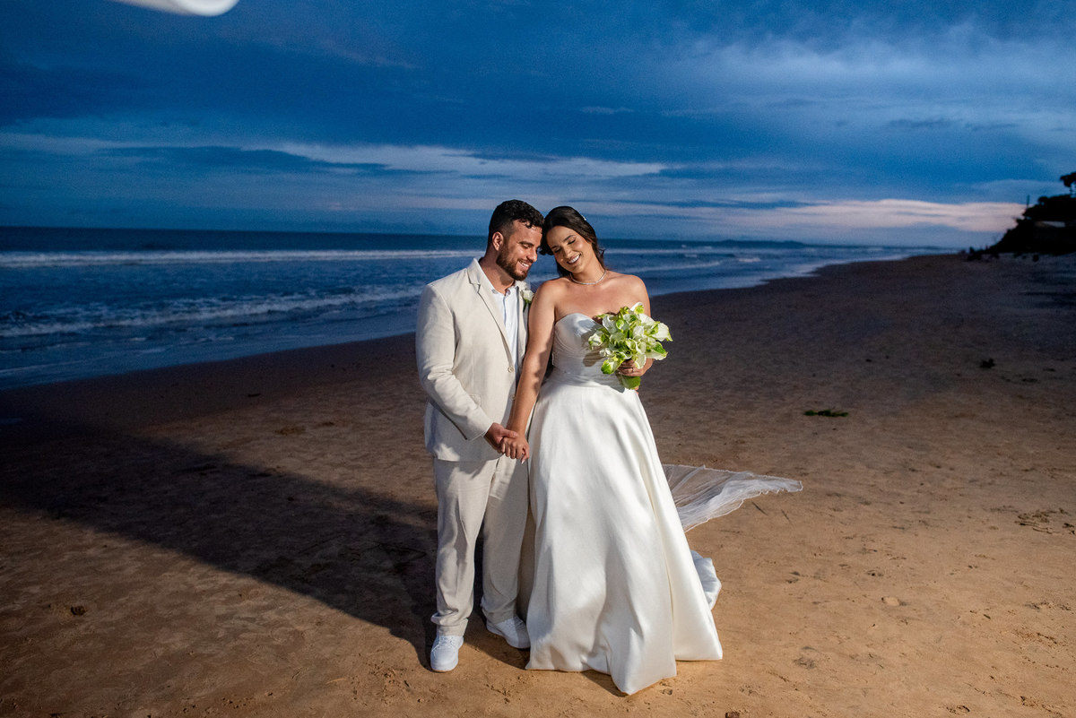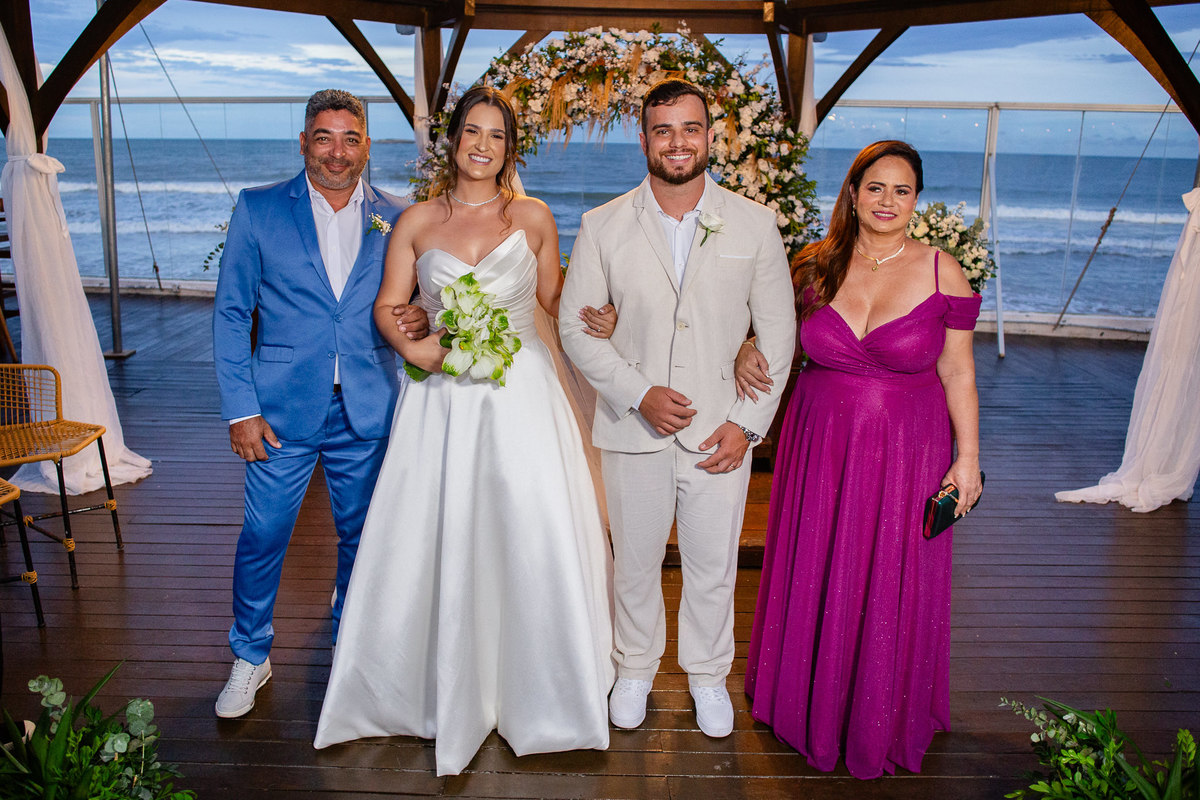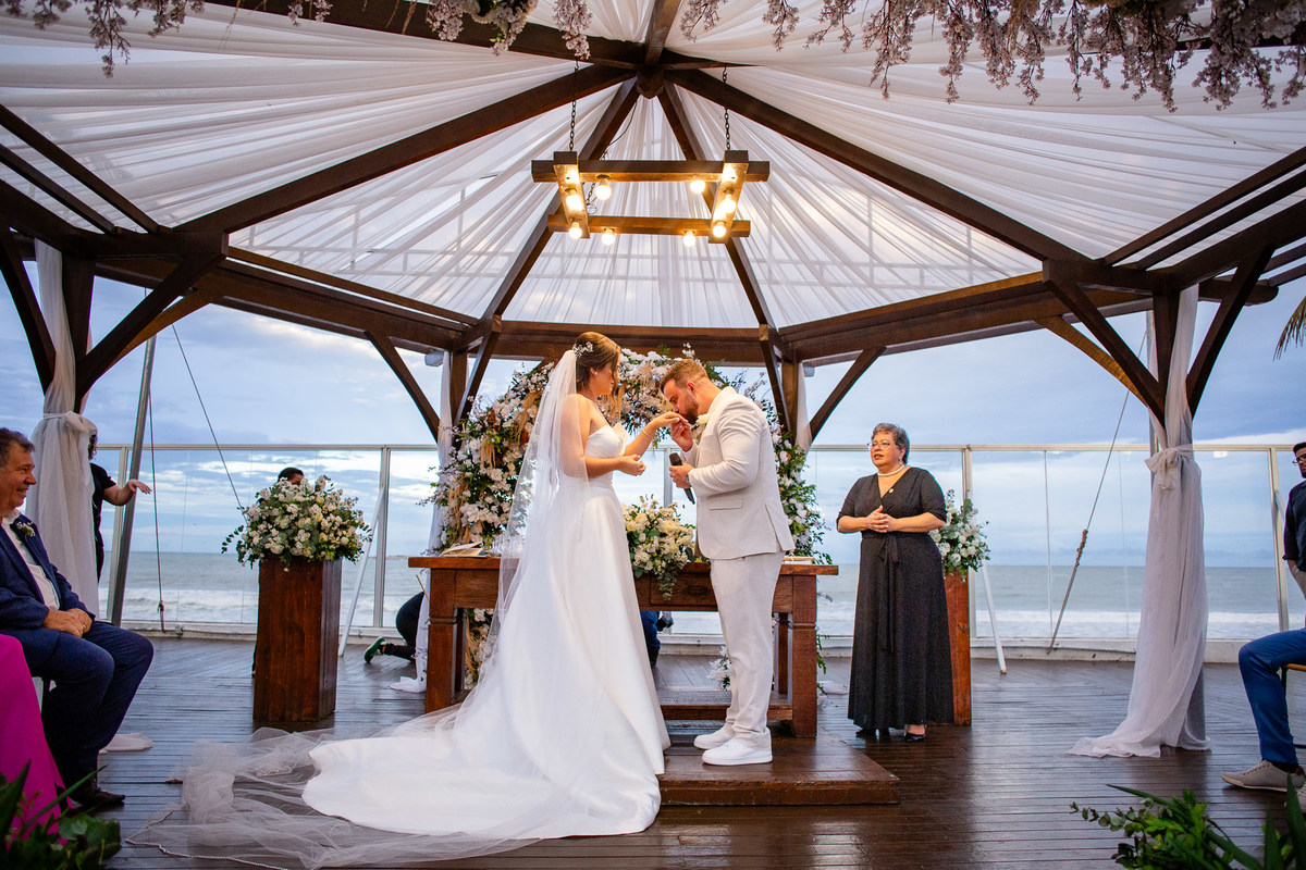 Às 16h30, chegou o tão aguardado momento: a hora do “sim”. A cerimônia foi simplesmente inesquecível, tendo como testemunha o mar infinito de Vila Velha. Emoção à flor da pele, olhares sinceros e muitos sorrisos marcaram essa união tão especial. A cerimônia das areias, conduzida pela celebrante e pelos próprios noivos, selou o compromisso com simbolismo e beleza.