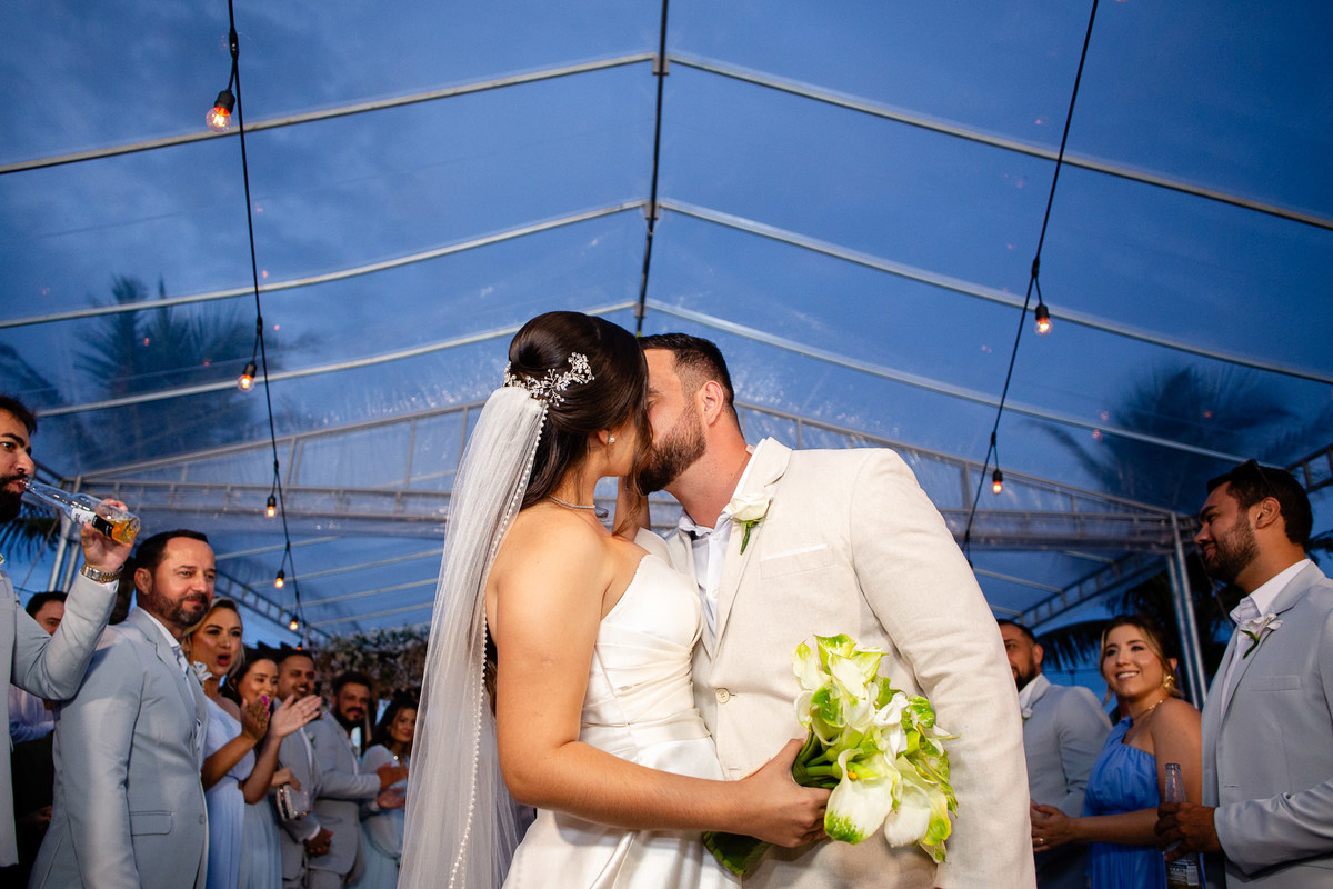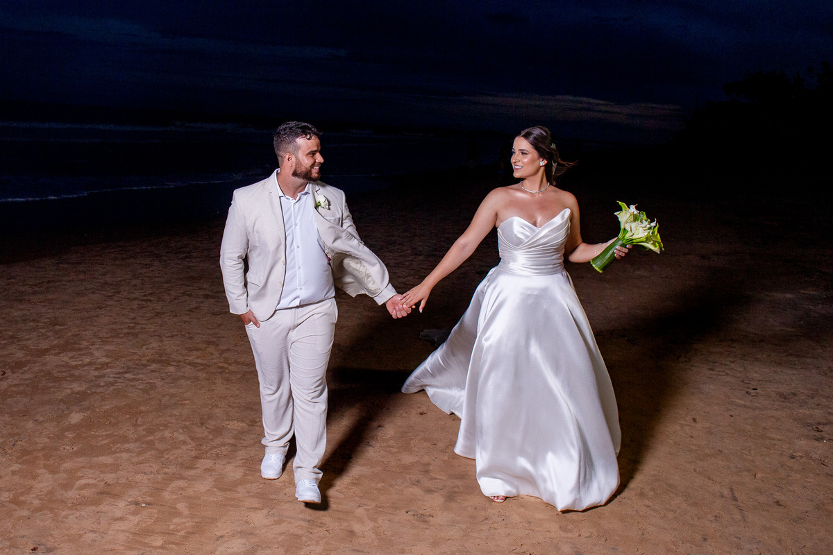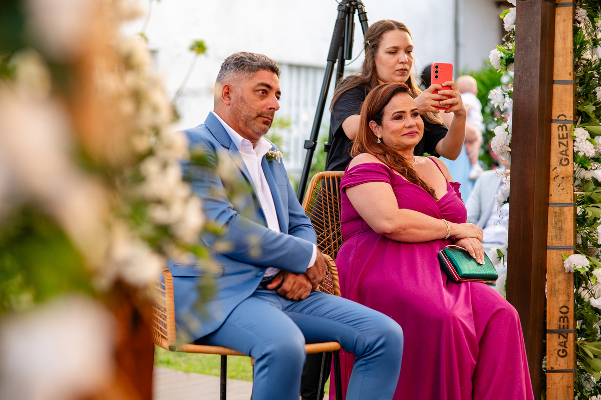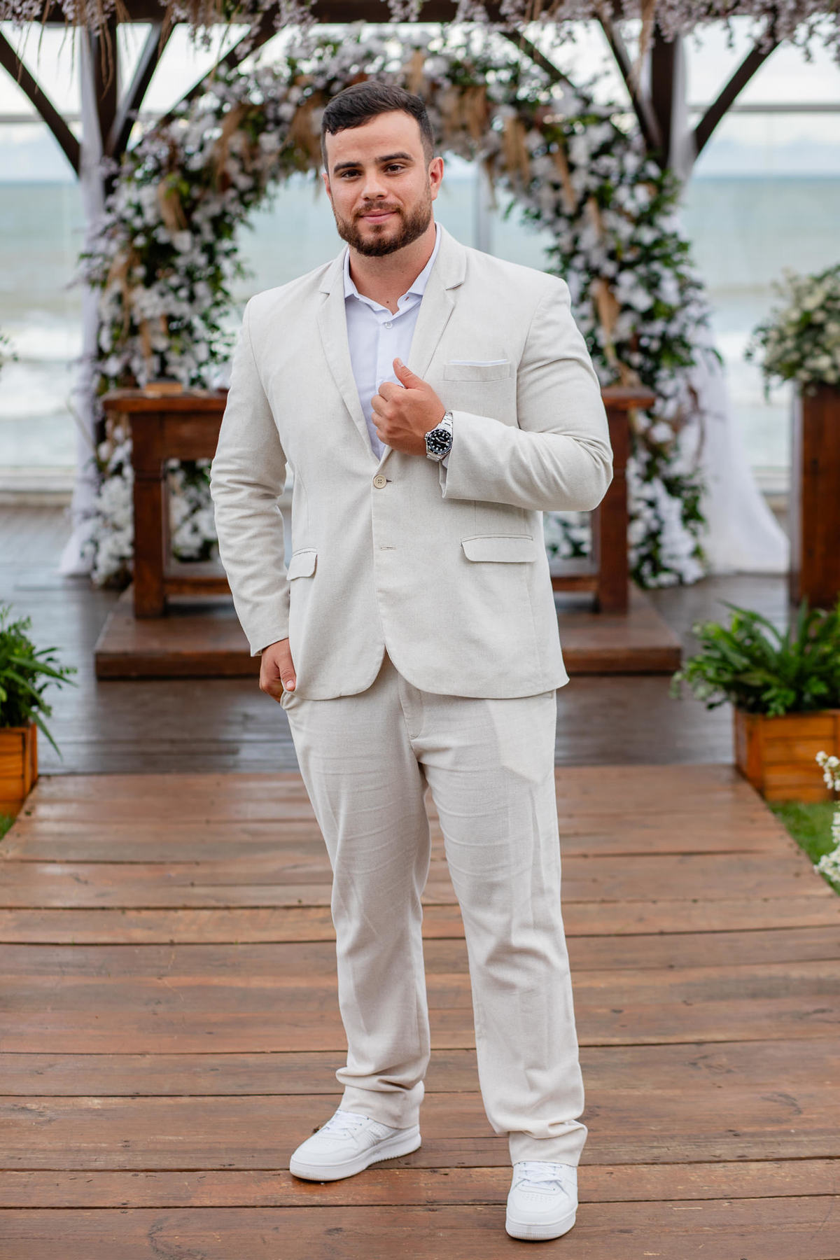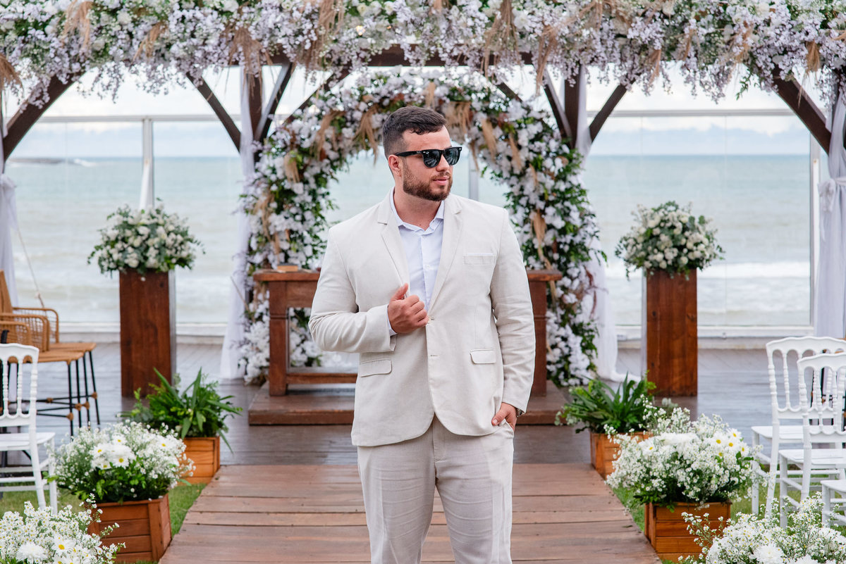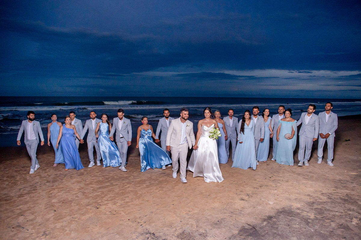 Às 16h30, chegou o tão aguardado momento: a hora do “sim”. A cerimônia foi simplesmente inesquecível, tendo como testemunha o mar infinito de Vila Velha. Emoção à flor da pele, olhares sinceros e muitos sorrisos marcaram essa união tão especial. A cerimônia das areias, conduzida pela celebrante e pelos próprios noivos, selou o compromisso com simbolismo e beleza.