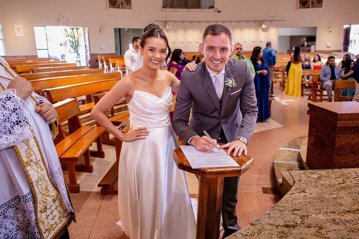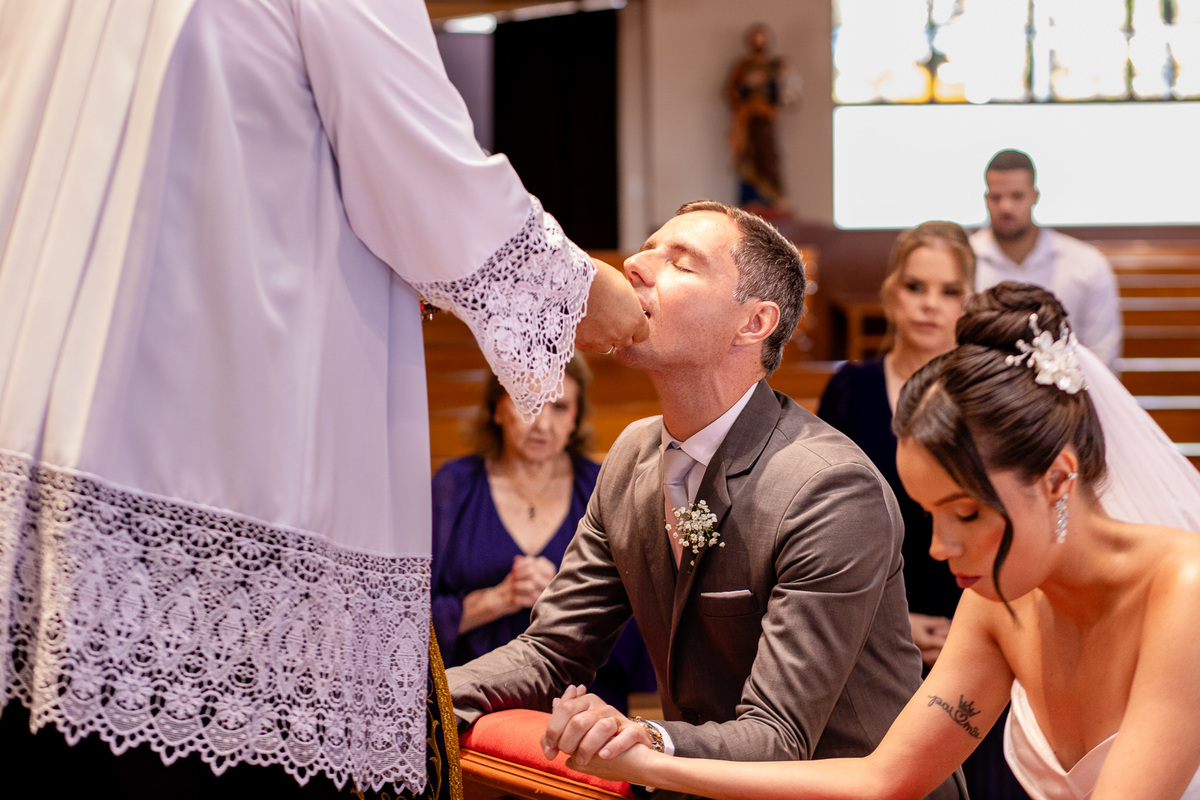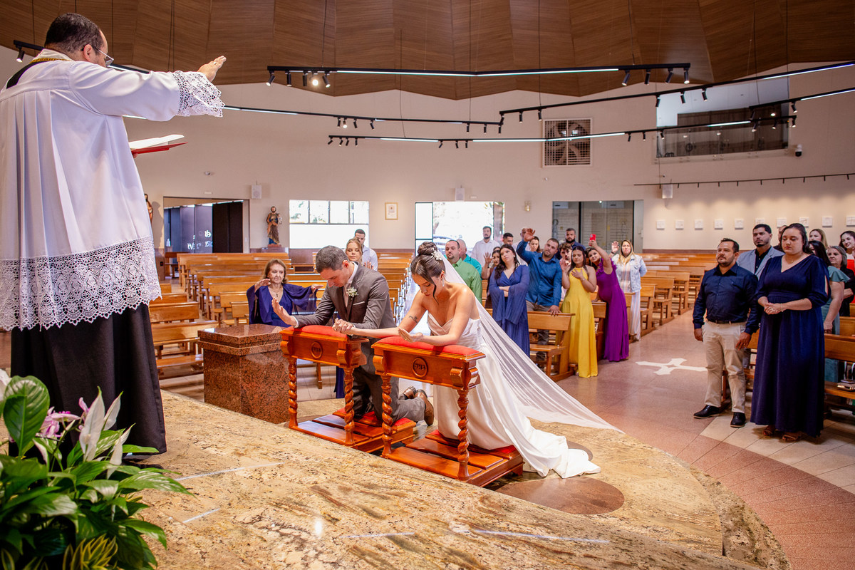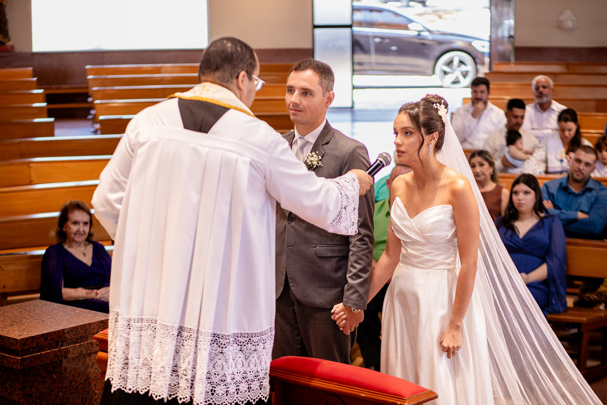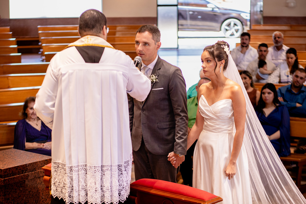 Um momento mágico e inesquecível. A cerimônia, conduzida pelo Padre Leonardo, foi marcada por palavras profundas e uma linda homilia. Em um clima de fé e amor, Fernanda e João disseram o tão aguardado “sim”, selando uma aliança eterna diante de Deus e de todos os presentes. Após a celebração, os tradicionais registros e um breve ensaio marcaram os últimos momentos na igreja antes da grande comemoração.